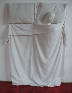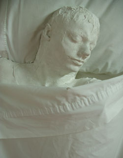 can work together to communicate a single concept. The sculptural component consists of a life-size plaster figure sleeping