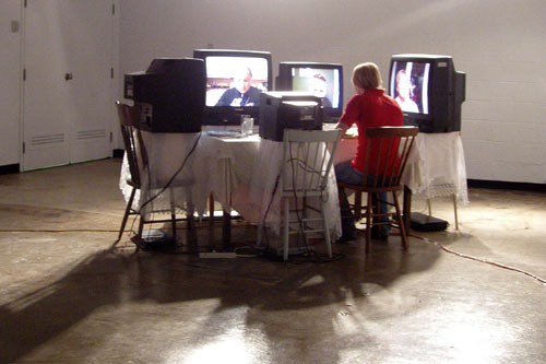 Performed at the Visionaria International Video Festival (Italy), the installation version of Quality Time with the Family consists of the artist performing his role at a mock dinner table setting where his family members are replaced by monitors playing videos of them eating.